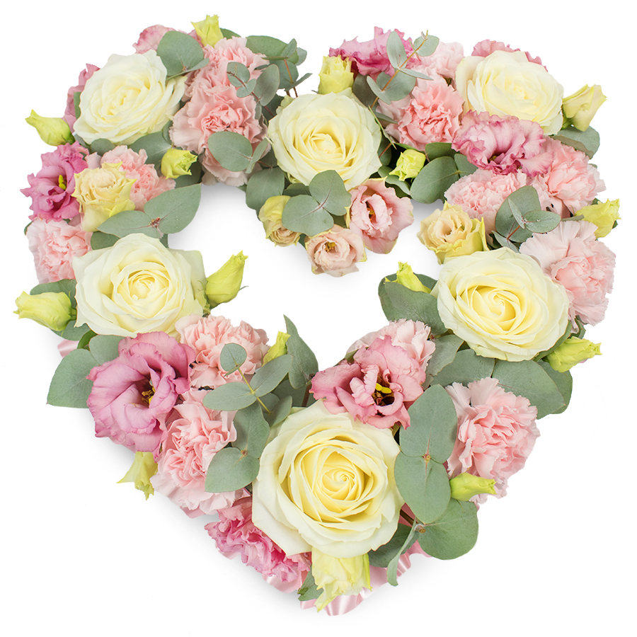 Convey your heartfelt sentiments with our Charming Open Heart Floral Tribute. This distinctive bouquet combines elegant white roses, soft pink carnations, graceful pink lisianthus, and eucalyptus accents, thoughtfully arranged to reflect love and remembrance.
